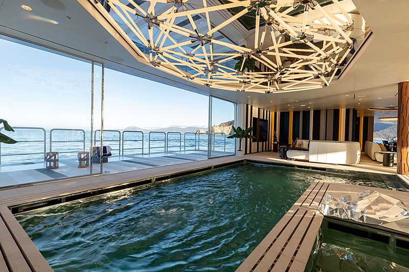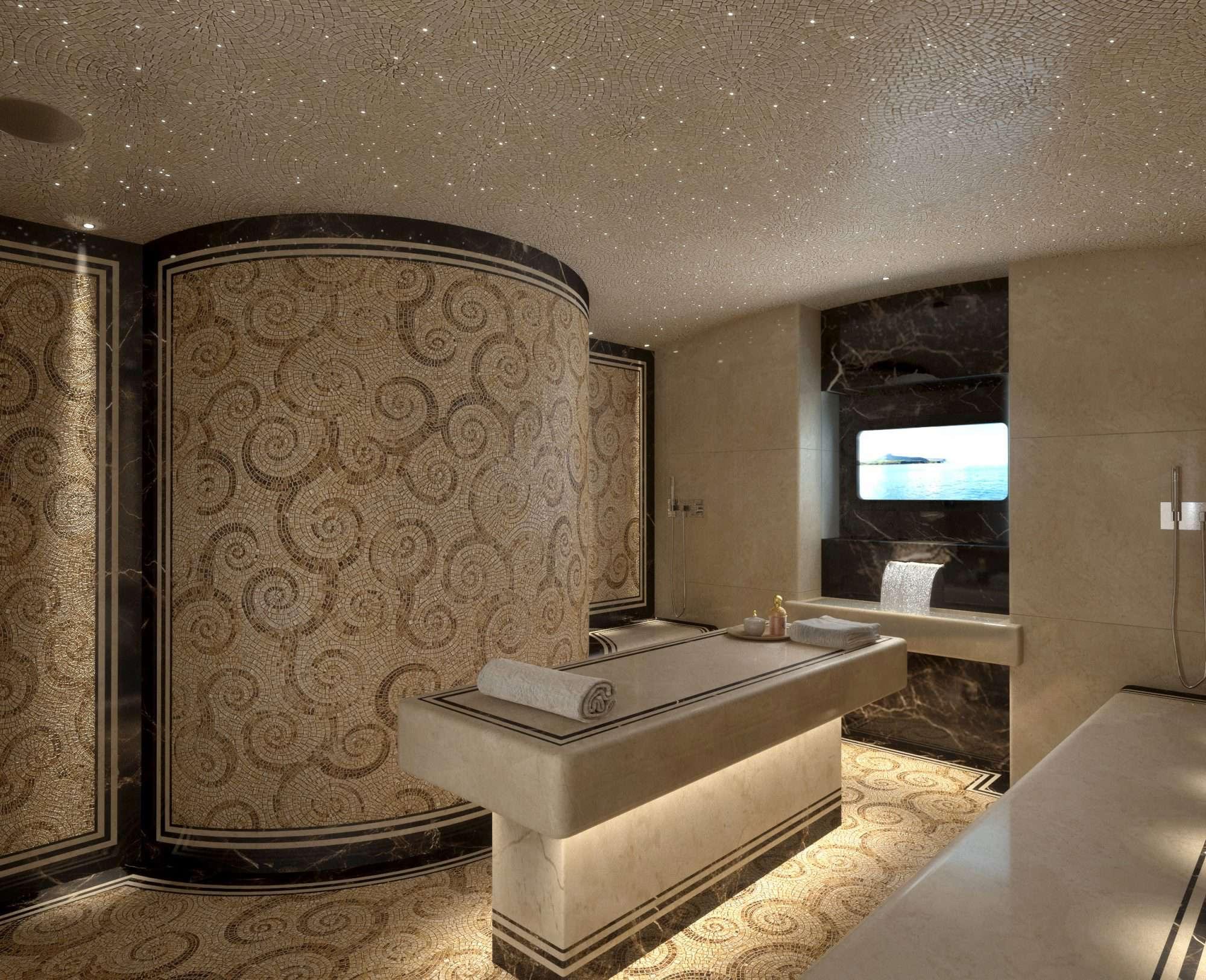 На мегаяхте - собственный частный роскошный оздоровительный клуб с баней. Если открыть боковые двери, все это превращается в спа-центр на уровне моря с полностью оборудованным тренажерным залом, холодным бассейном с температурой 4 ° C и бассейном площадью 30 кв.м, пол которого поднимается, образуя танцпол, и комфортабельной зоной отдыха.