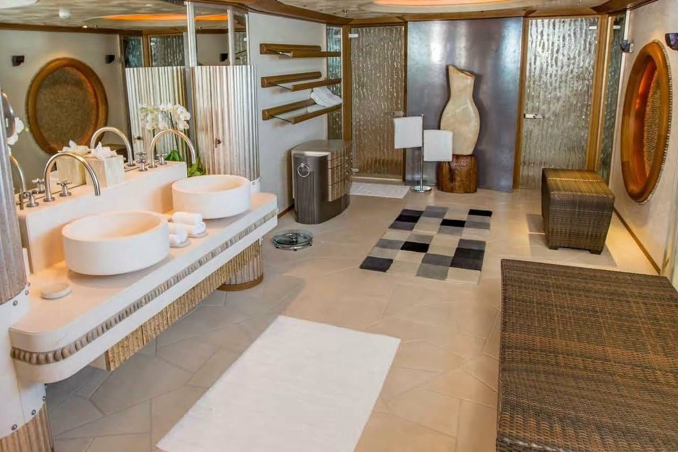 Это настоящая суперяхта-корабль, её длинный список уникальных особенностей включает две вертолётные площадки, панорамный лаунж-бар, трансформирующийся в ночной клуб, несколько балконов и террас с видом на море, кинотеатр, тренажерный зал, салон красоты, спа-центр, несколько бассейнов, палубу из камня, панорамные апартаменты владельца и множество тендеров, игрушек и водных видов спорта.