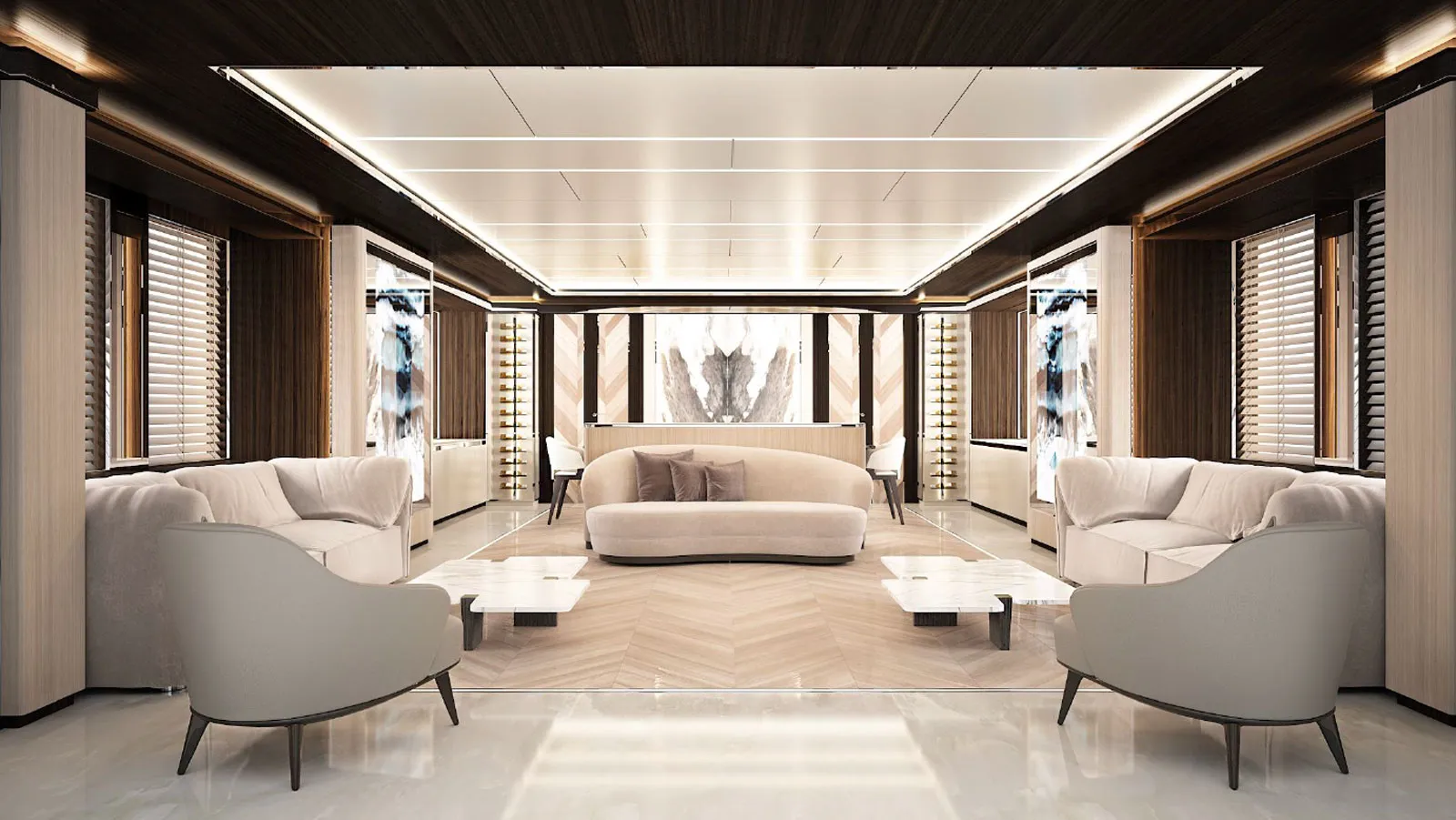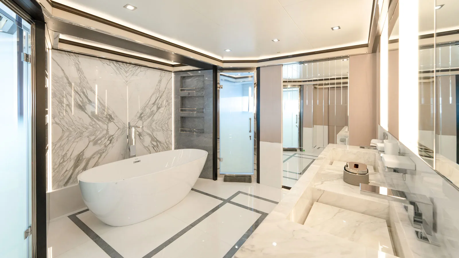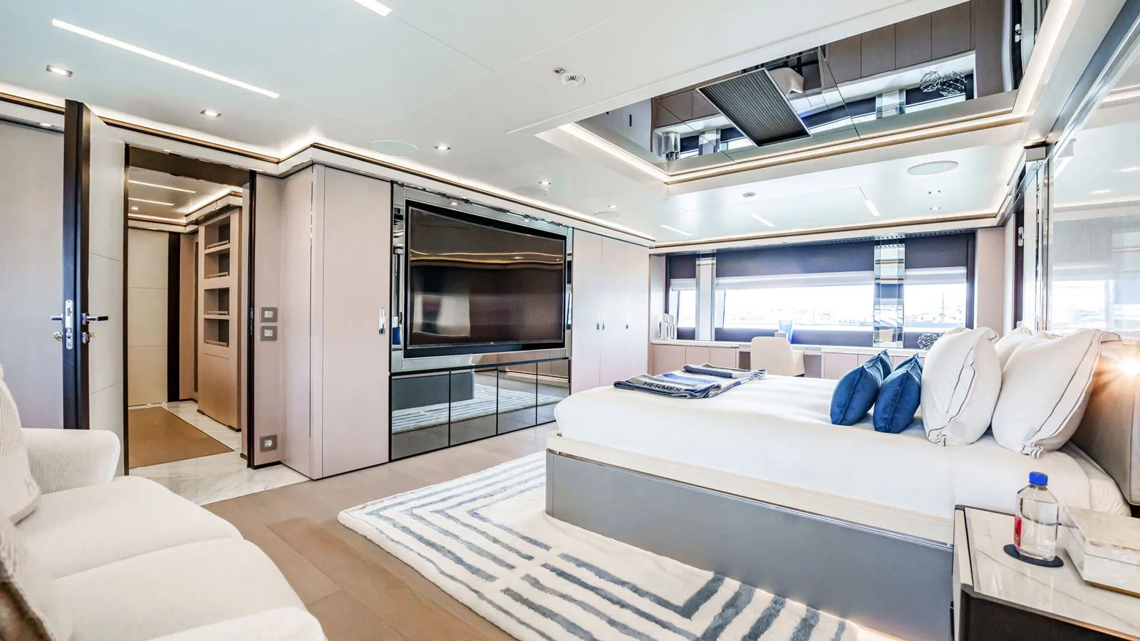 Верхняя палуба также предлагает идеальное место для отдыха с большим скай-лаунжем и баром, ведущим к круглому обеденному столу на свежем воздухе, грилю и шезлонгам, расположенным в кормовой части. Однако изюминкой этой палубы (и, возможно, всего судна) является прямоугольный бассейн в носовой части.
